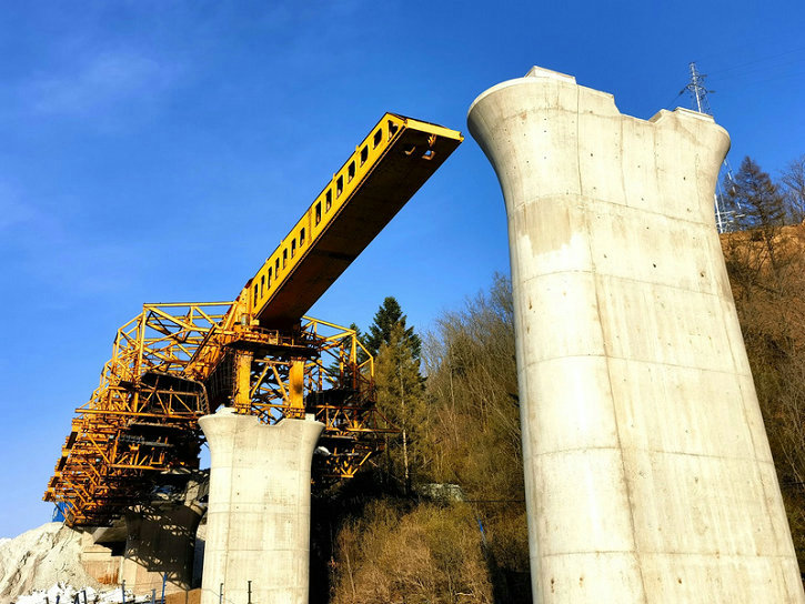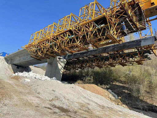 據(jù)悉,沈白高鐵湯河3號大橋位于撫松縣仙人橋鎮(zhèn)境內(nèi),橋長373.53米、12孔,分別與路基段和黑松谷隧道出口相連。跨越渾白鐵路、X096公路,其中3號至7號的5個(gè)橋墩位于雙河電站蓄水庫區(qū)內(nèi)。橋梁上部結(jié)構(gòu)采用上行式單導(dǎo)梁移動(dòng)模架法現(xiàn)澆施工。
