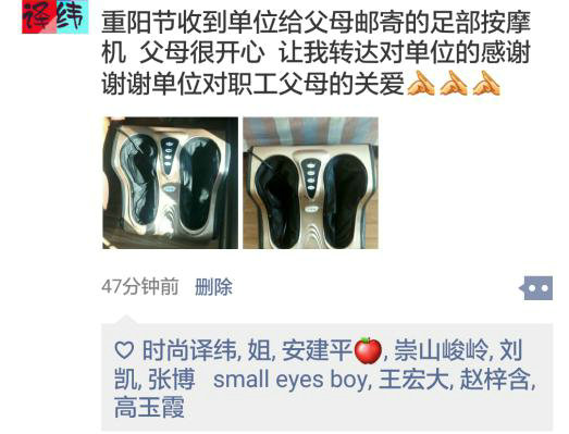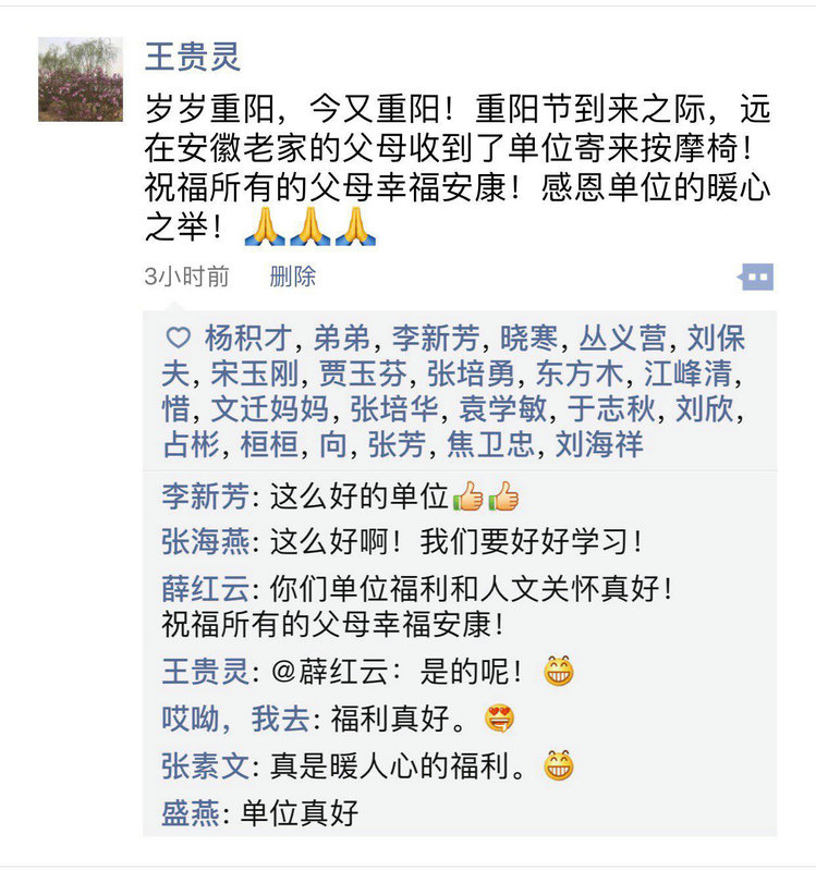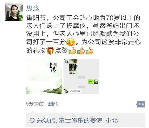 “感謝公司這么貼心的關(guān)愛,在這么一個(gè)特殊的日子里替我們給父母送上一份孝心,真是給了我們一個(gè)不小的驚喜,感謝父母恩情、感謝公司祝福”。職工們紛紛通過各種方式曬出了自己的心情。