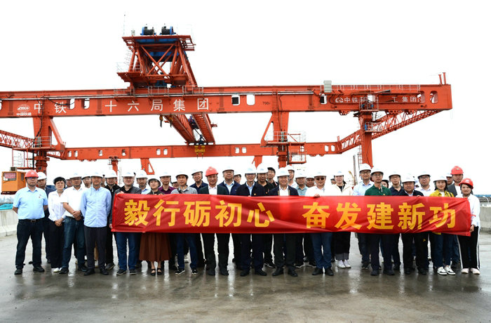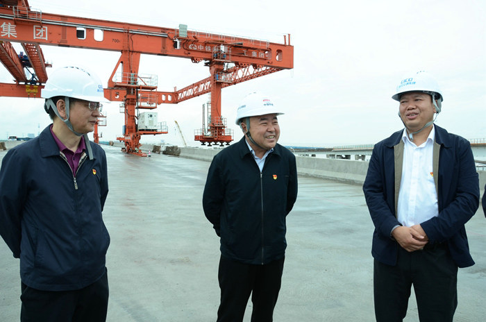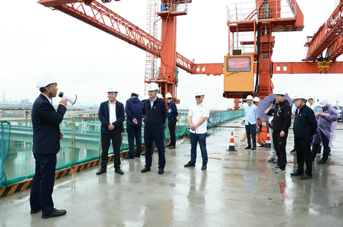 上午10點(diǎn),由寧波市交通局、業(yè)主、施工單位、監(jiān)理公司組成的55人觀摩團(tuán)沿杭甬復(fù)線主線橋面到達(dá)濱?;ネê诵膮^(qū)域。顧偉軍和樊獻(xiàn)鵬聽取了業(yè)主現(xiàn)場(chǎng)負(fù)責(zé)人陳宜保就濱?;ネㄈ绾瓮黄茙讉€(gè)關(guān)鍵節(jié)點(diǎn),為施工贏得主動(dòng)等情況介紹。公司副總經(jīng)理兼杭甬項(xiàng)目黨支部書記、項(xiàng)目負(fù)責(zé)人黃偉匯報(bào)了濱?;ネㄩ_工以來的安全質(zhì)量、進(jìn)度環(huán)保以及近期的架梁情況。他說,第一條匝道架梁已成功上跨金塘大橋,另外兩條匝道6月底也將完成上跨,有壓力,有風(fēng)險(xiǎn),但再大的困難也要克服。全體觀摩人員沿著主線橋兩側(cè)俯視完工的匝道橋和正在架設(shè)鋼混疊合梁的匝道,對(duì)這座即將完工的亞洲最大的海上互通贊不絕口,紛紛舉起相機(jī)對(duì)準(zhǔn)縱橫交錯(cuò)的匝道橋拍照,有的打開錄像功能錄像,有的拍照留念。顧偉軍和樊獻(xiàn)鵬一直面帶笑容,對(duì)濱海互通工程進(jìn)展、質(zhì)量、安全、環(huán)保等很滿意。顧偉軍說:“濱海互通是寧波市的地標(biāo)性建筑,海上施工,十五局克服了不少困難,能取得今天的成績(jī)不容易,希望把后期工程干好,期待完美收官好消息。”樊獻(xiàn)鵬提出三點(diǎn)要求:一是要做好夏季防暑降溫工作,保護(hù)好每一個(gè)員工。二是架梁是高空作業(yè),每一片梁都是100多噸,安全措施要落實(shí)到位,不能有絲毫麻痹,要確保萬無一失。三是橋面、護(hù)欄等附屬工程也很重要,要保證質(zhì)量,不能出現(xiàn)明顯的瑕疵。”