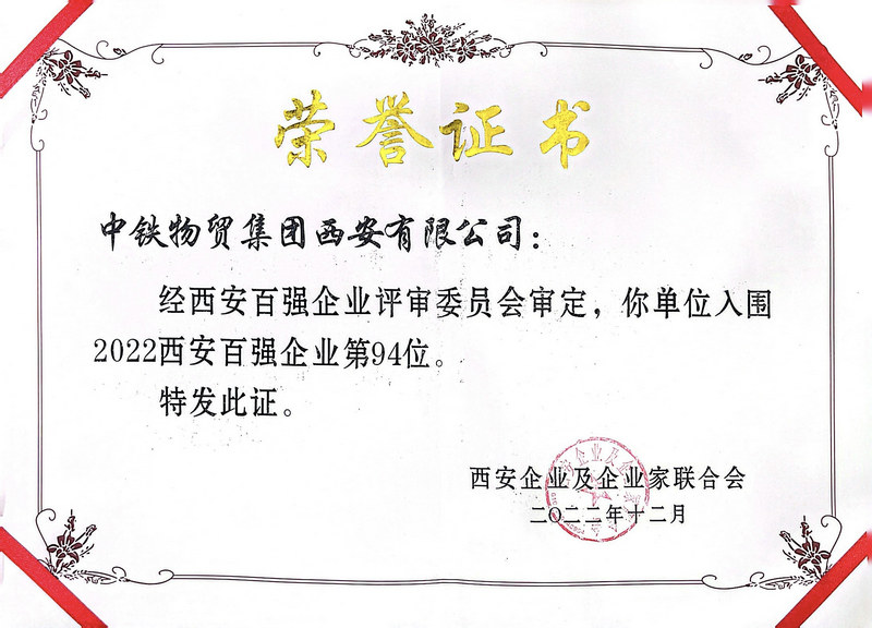 近日,西安市“2022西安百?gòu)?qiáng)企業(yè)”榜單隆重揭曉,中鐵物貿(mào)西安公司成功入圍榜單第94位。自2019年進(jìn)入西安百?gòu)?qiáng)企業(yè)榜單以來(lái),西安公司連續(xù)4年穩(wěn)居行列。