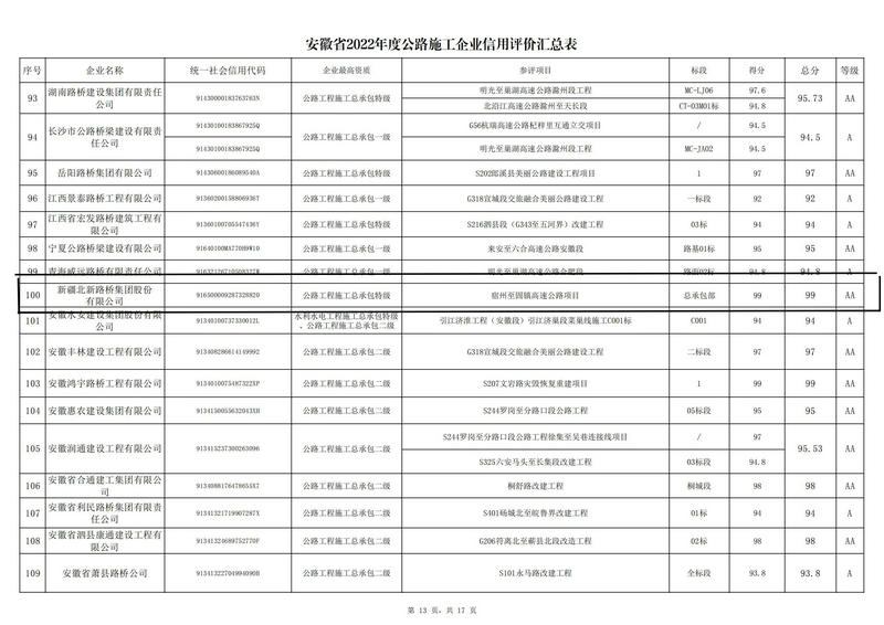 從安徽省交通運輸廳網(wǎng)站獲悉,北新路橋集團憑借良好的企業(yè)形象獲評2022年度安徽省公路施工和設(shè)計企業(yè)信用評價 A A級,這是該集團自進入安徽市場以來首次獲此殊榮。