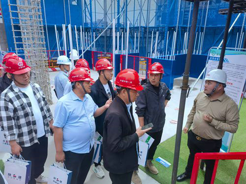 過程中,觀摩人員參觀了兩個(gè)項(xiàng)目的標(biāo)準(zhǔn)化施工現(xiàn)場(chǎng)、施工樣板間,詳細(xì)的對(duì)項(xiàng)目現(xiàn)場(chǎng)噴淋設(shè)施布設(shè)、臨電橋架標(biāo)準(zhǔn)化、大型設(shè)備防護(hù)、作業(yè)區(qū)域防護(hù)搭設(shè)、微型消防站、應(yīng)急物資庫(kù)房標(biāo)準(zhǔn)化建設(shè)、VR智慧體驗(yàn)管、成品保護(hù)、主體結(jié)構(gòu)工藝工法等進(jìn)行了取經(jīng)、交流。項(xiàng)目在施工現(xiàn)場(chǎng)綠色低碳文明施工、臨時(shí)用電、智能化工地建設(shè)等方面給一行人員留下了深刻印象。