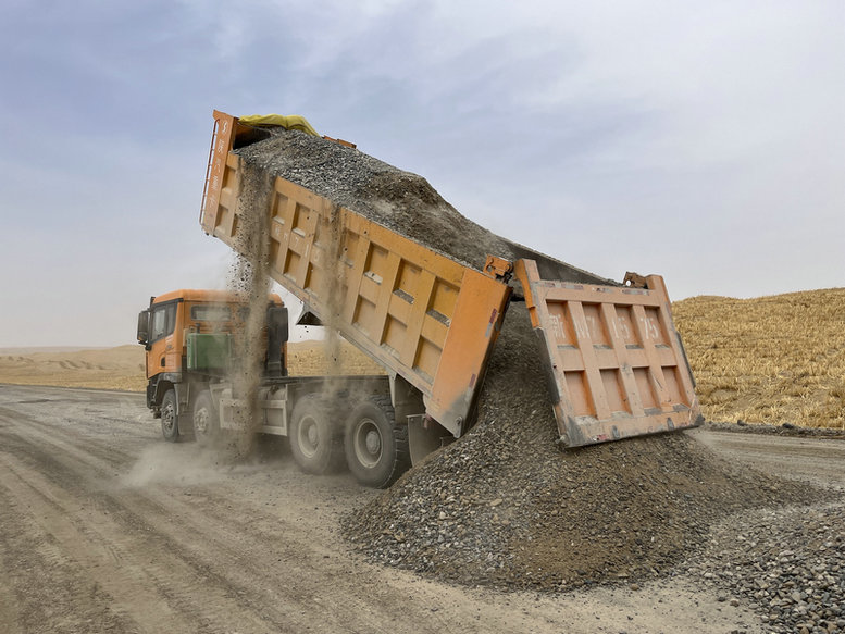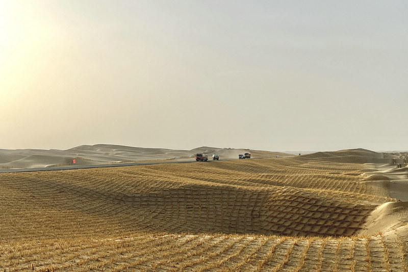 38團(tuán)訊(通訊員 崔振杰)5月15日,北新路橋集團(tuán)國(guó)際工程事業(yè)部第二師38團(tuán)至塔中沙漠公路項(xiàng)目上自卸車來回奔忙。該項(xiàng)目目前在沙漠中設(shè)有兩處營(yíng)地點(diǎn),無信號(hào)、無水電,一切補(bǔ)給靠外部營(yíng)地點(diǎn)運(yùn)輸,但就是在這樣越來越惡劣的變化中項(xiàng)目一點(diǎn)一滴推進(jìn)成型。如蒼龍潛地,飛沙走石中、艷陽(yáng)高照時(shí)、萬(wàn)里晴空下,自卸車往來奔忙、施工員駐足指揮、草方格徐徐鋪展,靜止與運(yùn)動(dòng)的平衡中“沙漠黃龍”直搗天際。