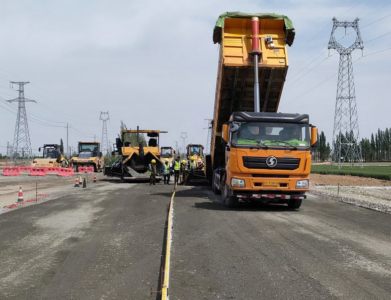 2023年5月20日,北新順通路橋G312線項(xiàng)目部施工現(xiàn)場(chǎng),在震耳的鞭炮聲中,水穩(wěn)運(yùn)輸車輛貨箱緩緩升起,水穩(wěn)料傾瀉進(jìn)攤鋪機(jī)儲(chǔ)料倉(cāng),水穩(wěn)攤鋪機(jī)有條不紊地前進(jìn),壓路機(jī)來(lái)回碾壓基層路面,工人正忙著鋪筑水穩(wěn)層,由北新順通路橋施工的G312線主線K3+800-K4+000水穩(wěn)基層試驗(yàn)段攤鋪正式開始。
