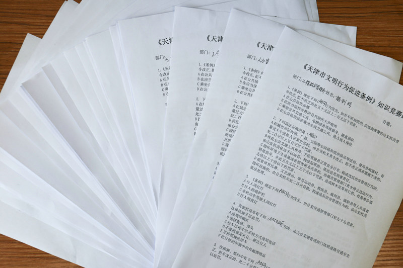 為調(diào)動大家學(xué)習(xí)《天津市文明行為促進(jìn)條例》的積極性,強(qiáng)化和檢驗(yàn)學(xué)習(xí)效果,他們還組織了專門的知識競賽。內(nèi)容涉及《條例》的方方面面。通過組織大家答題,強(qiáng)化記憶、查漏補(bǔ)缺,讓《條例》內(nèi)容深入人心,增強(qiáng)大家文明意識的同時,推動大家把學(xué)習(xí)成果轉(zhuǎn)化為實(shí)實(shí)在在的文明行為。