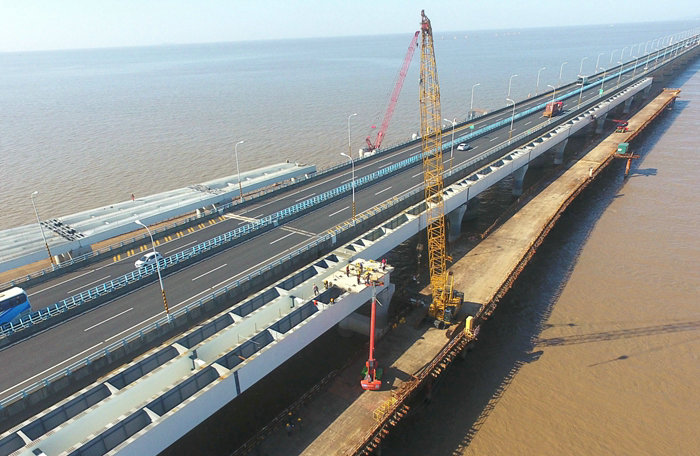 鐵路工程建設(shè)網(wǎng)24日寧波電(特約通訊員呂奎元 通訊員趙文浩)5月23日,一臺(tái)履帶吊將一片約10噸重的長(zhǎng)方形鋼混結(jié)構(gòu)橋面板安放在濱?;ネ?號(hào)拼寬橋鋼箱梁上,至此,由浙江交通集團(tuán)牽頭建設(shè)、中鐵十五局承建的杭甬項(xiàng)目濱?;ネㄆ磳挊蛎姘暹M(jìn)入與金塘大橋銜接施工階段。