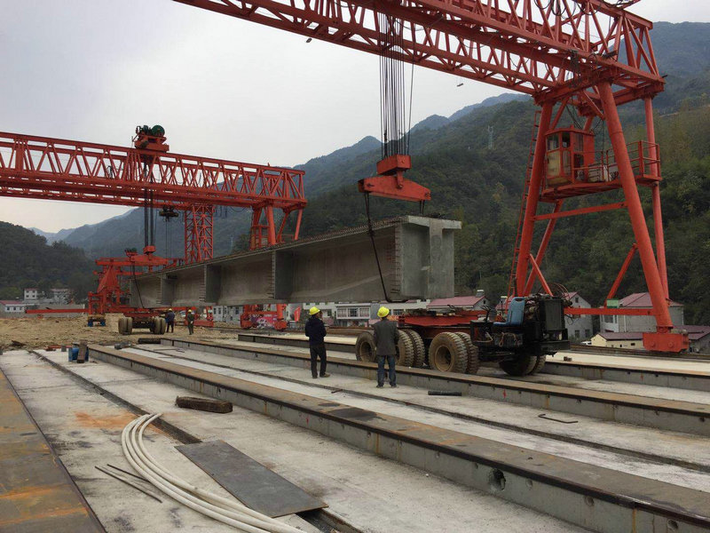 保神高速二標(biāo)全長(zhǎng)11.14公里,橋梁占2.55公里,其中中形橋90米2座,大形橋360米3座,特大橋1290米1座。設(shè)計(jì)共需30米T梁850片,本次吊裝的是高碑3號(hào)橋右幅第一跨T梁,高2米,長(zhǎng)30米,重達(dá)80噸。架梁分為運(yùn)輸、安裝兩個(gè)階段,采用兩臺(tái)運(yùn)梁炮車進(jìn)行運(yùn)輸,通過架橋機(jī)進(jìn)行安裝。運(yùn)輸過程中,提前安排專員排查路況及吊裝現(xiàn)場(chǎng)情況,排除隱患,確保安全。運(yùn)輸?shù)轿缓?,通過架橋機(jī)經(jīng)喂梁、縱移以及橫移后落梁就位,就位時(shí)又進(jìn)行多次調(diào)整,確保精確穩(wěn)固。