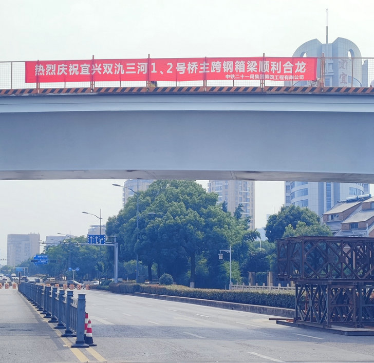 6月11日,中鐵二十一局四公司宜興雙氿三河一期1號(hào)橋主跨上跨氿濱大道鋼箱梁順利合龍,標(biāo)志著該橋重點(diǎn)控制性工程圓滿收官。