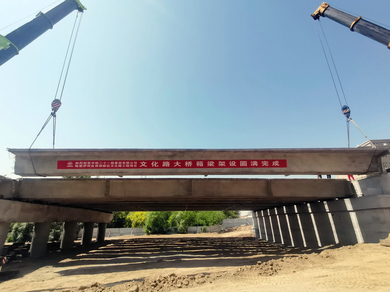文化路大橋跨越西河壩,橫穿哈密河國家濕地公園,是集景觀性、功能性、環(huán)保性于一體的橋梁,既能滿足居民的出行需求,也能最大程度節(jié)約用地,更好地保護哈密河生態(tài)環(huán)境。此次大橋箱梁順利架設(shè)完成,打通了文化路全線最重要的施工斷點,為后續(xù)水穩(wěn)基層及瀝青面層施工爭取了有效工期,下一步將全力以赴推進施工建設(shè),確保今年9月按期開通。