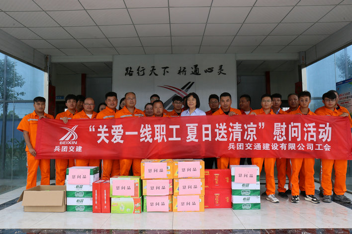 宿州訊(通訊員 劉繼紅)炎炎夏日送清涼,公司關(guān)愛(ài)暖人心。為傳遞公司黨委及工會(huì)對(duì)基層職工的關(guān)懷,致敬高溫下仍?shī)^戰(zhàn)在項(xiàng)目一線的基層建設(shè)者,6月18日,兵團(tuán)交建公司總經(jīng)濟(jì)師楊偉娜赴安徽宿固TJ02合同段項(xiàng)目開(kāi)展“關(guān)愛(ài)一線職工,夏日送清涼”慰問(wèn)活動(dòng)。