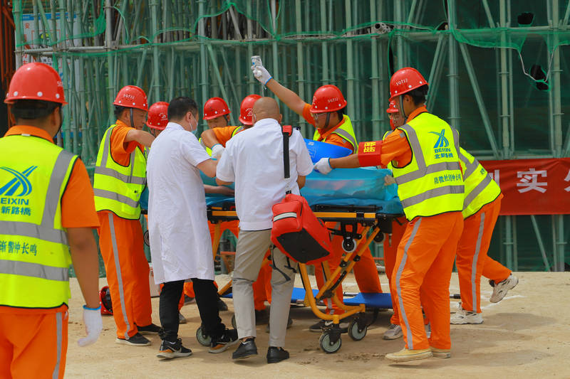 隨著演練總指揮一聲指令,演練正式開始,所有參練人員著裝整齊,按照應(yīng)急預(yù)案分工組織實施。此次演練模擬因天氣較熱,施工人員在爬梯塔過程中腳下踩空,不慎從5米多高的臨邊防護(hù)處跌落摔傷,頭部出血,陷入昏迷狀態(tài)。事故發(fā)生后同班作業(yè)人員立即報告安全員,安全員立即撥打救援電話,迅速向上級簡要報告事故情況(事故發(fā)生地點(diǎn)、人員傷亡情況等),立即啟動應(yīng)急救援預(yù)案,并對受傷人員采取臨時救助。救援小組快速判斷事故狀況并拉起警戒線,進(jìn)行救援。隨著救護(hù)車到達(dá)事故現(xiàn)場,傷員被安全送往醫(yī)院,險情告一段落。事故調(diào)查組隨即對事故展開調(diào)查,總結(jié)原因教訓(xùn)。