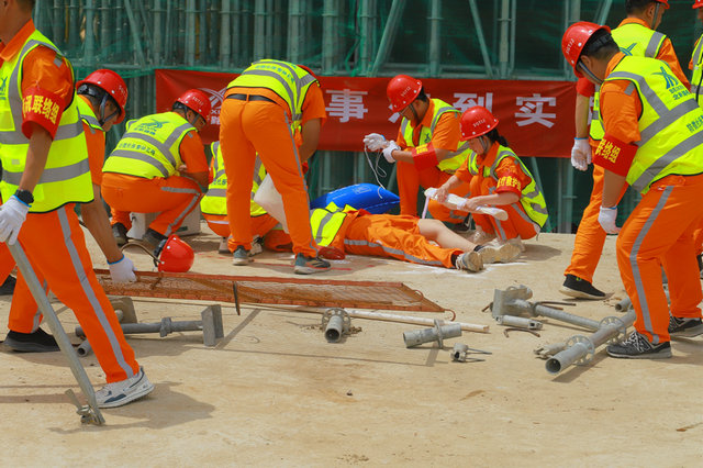 本次演練模擬新汴河特大橋施工現(xiàn)場安全爬梯安裝施工時,施工作業(yè)人員因未掛安全帶,失足從爬梯上墜落,導(dǎo)致發(fā)生高處墜落事故,作業(yè)人員頭部及腿部受傷嚴(yán)重。接到事故通知后,項目部立即啟動應(yīng)急救援預(yù)案,保衛(wèi)警戒組、應(yīng)急救援組、通信聯(lián)絡(luò)組、醫(yī)療救護(hù)組、后勤保障組、善后處理組等攜帶救援設(shè)備迅速趕赴現(xiàn)場實(shí)施救援,同時協(xié)調(diào)醫(yī)院等外部救援力量,讓傷者迅速得到進(jìn)一步治療。演練過程中,各應(yīng)急救援小組反應(yīng)迅速、分工明確、緊密配合,第一時間開展救援并成功處置險情。
