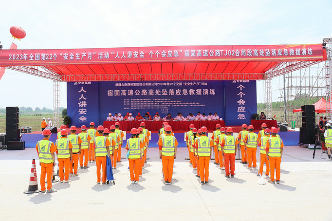 宿州訊(通訊員 劉繼紅)6月21日,兵團(tuán)交建公司安徽宿固高速TJ02合同段項目組織開展高空墜落應(yīng)急救援演練活動。宿州市交通局陳鳳軍局長、宿州交通執(zhí)法大隊郁副梅支隊長、埇橋區(qū)應(yīng)急局胡少山主任、宿州市皖北醫(yī)院急救中心安小峰主任、宿固高速公司領(lǐng)導(dǎo)及宿固高速項目各參建單位代表等100余人參加活動。