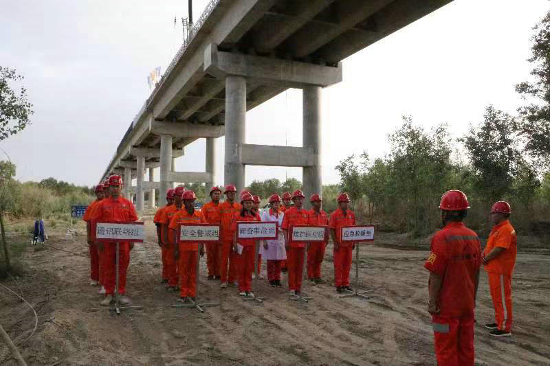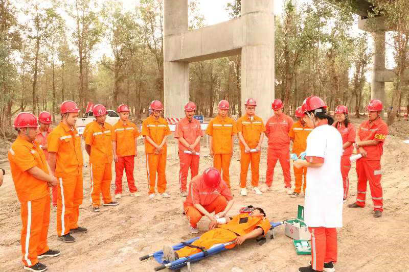 本次演練模擬背景于一名工人在葉爾羌河特大橋14#墩作業(yè)平臺(tái)鋼筋綁扎施工過程中,由于未系好安全帶不慎從高處墜落至地面,被現(xiàn)場(chǎng)技術(shù)員及時(shí)發(fā)現(xiàn),立即向總指揮報(bào)告事故突發(fā)情況,總指揮接到報(bào)告后立即啟動(dòng)高處墜落安全事故應(yīng)急救援預(yù)案,通知現(xiàn)場(chǎng)搶險(xiǎn)救援組、醫(yī)療救護(hù)組、警戒疏散組、通訊聯(lián)絡(luò)組、事故調(diào)查組、后勤保障組等小組立即趕赴事故現(xiàn)場(chǎng),按照應(yīng)急預(yù)案迅速開展救援全部環(huán)節(jié)。