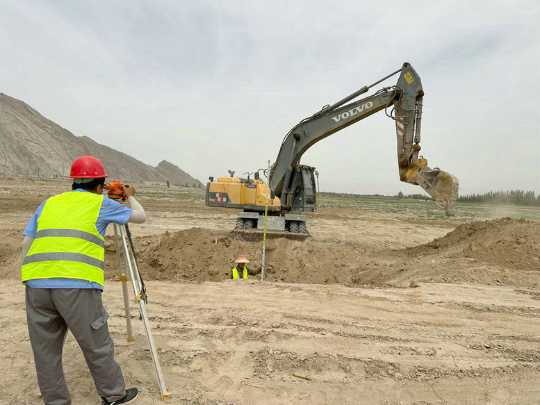 酷熱三伏天,圖木舒克經(jīng)濟(jì)技術(shù)開發(fā)區(qū)唐王城新型材料產(chǎn)業(yè)園一期安陽路、康平路片區(qū)基礎(chǔ)設(shè)施建設(shè)項(xiàng)目(三標(biāo)段)施工現(xiàn)場一篇大干景象,下午4點(diǎn)多,地面溫度高達(dá)40多度,技術(shù)員馬海東說“天氣再熱,儀器架好以后,站在這里就不能動(dòng)了,因?yàn)槿艘粍?dòng)就會(huì)碰到三腳架的腳架,碰到以后,前視后視的檢測點(diǎn)精度就會(huì)不準(zhǔn),然后產(chǎn)生的數(shù)據(jù)就不會(huì)吻合”,站在烈日下十分鐘,額頭上的汗珠止不住的往下流。圖為堅(jiān)守在一線崗位上的測量工作人員馬海東,正在測量K0+500段供熱管道的開挖高程。