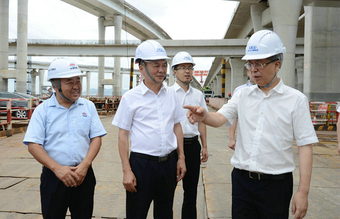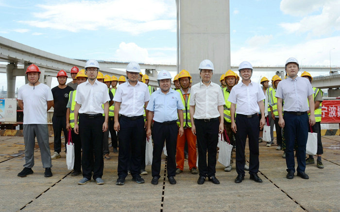 陳敏在濱?;ネê诵膮^(qū)域環(huán)顧四周凌空飛架的一座座匝道橋說:“這個(gè)亞洲最大的海上互通,干到今天這個(gè)程度不容易,你們十五局是很有實(shí)力的。收尾施工,進(jìn)度、質(zhì)量、安全、環(huán)保要四管齊下,安全要放在第一位。夏天橋上施工,做好安全防護(hù),預(yù)防員工中暑、患熱射病是重中之重,只要安全措施到位就不會(huì)出問題。”