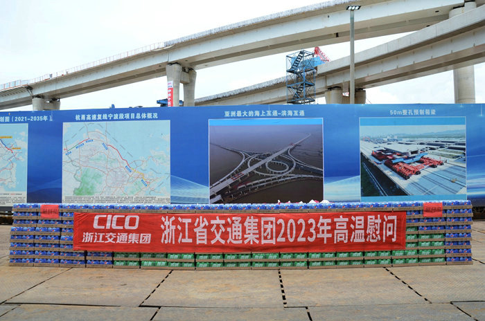 陳敏代表浙江交通集團(tuán)有限公司領(lǐng)導(dǎo)班子,專程從杭州趕到寧波杭甬復(fù)線濱?;ネüさ乜赐⑽繂枮闉I海互通順利完成架梁任務(wù)付出辛勤勞動(dòng)的公司員工。他將112件易拉罐百事口樂、112件雪碧和112套手提袋、毛巾、牙膏牙刷送給冒酷暑堅(jiān)守施工現(xiàn)場的廣大員工,表達(dá)對(duì)全體員工的親切問候和誠摯的敬意。陳敏與作業(yè)工人進(jìn)行了零距離交談,噓寒問暖,詢問兩名工人身體怎么樣,能不能適應(yīng)炎熱的天氣,有沒有防暑藥品等等,他們?nèi)鐚?shí)作了回答。陳敏對(duì)公司杭甬項(xiàng)目部人性化管理、對(duì)員工的貼心關(guān)愛比較滿意。公司副總經(jīng)理兼杭甬項(xiàng)目黨支部書記、項(xiàng)目負(fù)責(zé)人黃偉匯報(bào)了濱?;ネüこ谈艣r、安全質(zhì)量、施工進(jìn)展、隊(duì)伍管理、下一步施工重點(diǎn),以及在盛夏酷暑季節(jié),為保證員工生命安全采取的多項(xiàng)防暑降溫措施等情況。