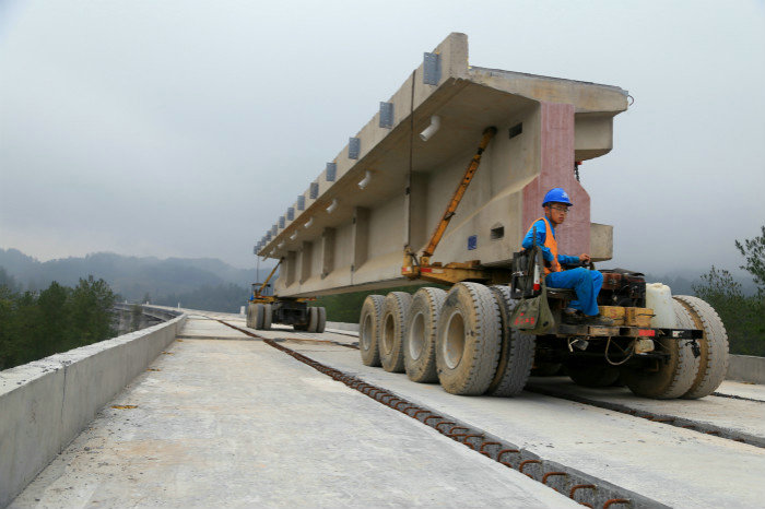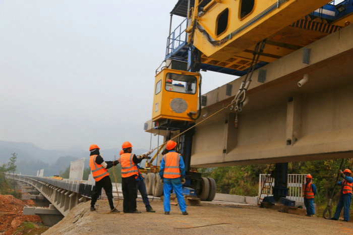 運(yùn)梁車(chē)平穩(wěn)地行駛在鐵爐堡特大橋上