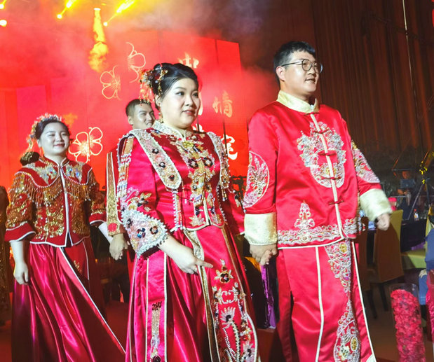 上午8時(shí),來(lái)自該公司管內(nèi)施工生產(chǎn)一線的8對(duì)新人,脫下一身工裝換上新婚禮服,在父母親友和領(lǐng)導(dǎo)同事的見證下,雙雙跨火盆、邁馬鞍等儀式,步入新婚的殿堂。通過行結(jié)發(fā)禮、執(zhí)手禮、合巹禮、三拜禮,盛裝開啟人生的美好征程。
