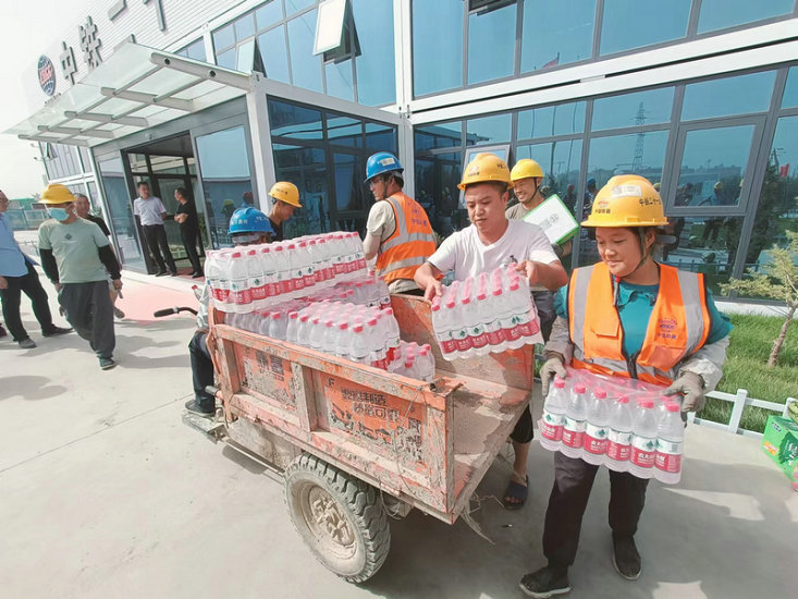 8月19日,中鐵二十一局一公司阿拉爾塔職院二期項(xiàng)目部院內(nèi)人來人往像過節(jié)一般熱鬧,職工、勞務(wù)工們有的推著小車、有的開著電動(dòng)三輪車來領(lǐng)取一公司工會(huì)送來的“清涼”——礦泉水、飲料、西瓜、綠豆、白糖……