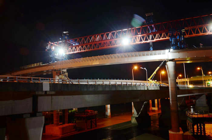 4月份,該項(xiàng)目部組織開(kāi)展“90天六比六創(chuàng).鐵建杯”勞動(dòng)競(jìng)賽,將全員的智慧和力量凝聚到項(xiàng)目的安全質(zhì)量和進(jìn)度上來(lái)。隨著濱?;ネㄐ读赫竞吞崃赫镜慕ǔ?,由舟山曲線海運(yùn)鋼混疊合梁改為直達(dá)濱海互通現(xiàn)場(chǎng),架梁進(jìn)度大大加快。4月7日濱?;ネㄆ磳挊虻谝黄摶殳B合梁架設(shè)成功、27日F匝道架梁順利上跨金堂大橋、5月28日和6月8日第4和第5座匝道架梁相繼完成。6月27日2號(hào)拼寬橋右幅與金塘大橋相接、6月25日A、D匝道架梁成功上跨金塘大橋,消除了濱?;ネㄗ畲蟮陌踩L(fēng)險(xiǎn)。