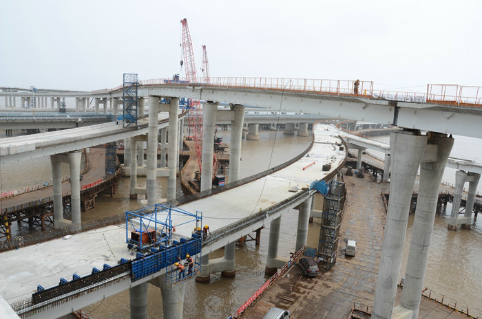 為便于混凝土在高空橋面澆筑,該項目部將混凝土罐車用履帶吊將其“請”到橋上,與混凝土泵車配合完成路面澆筑任務(wù),工效大大提高。