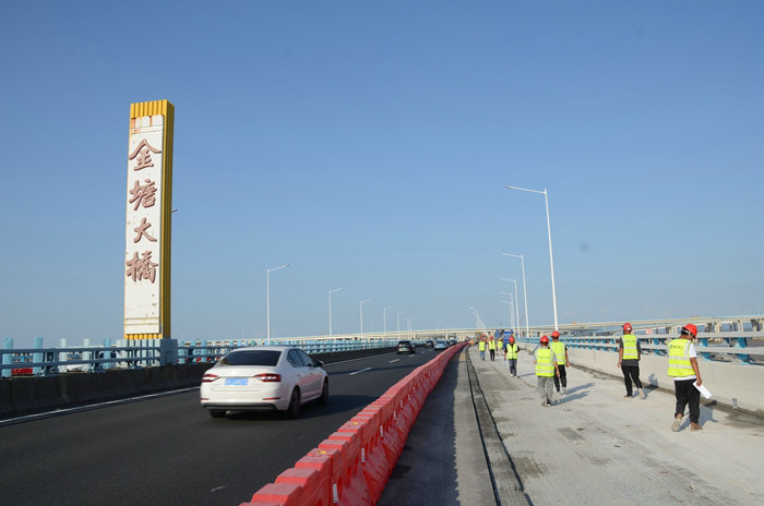 拼寬橋預制板與金塘大橋拼接完成后,進行防撞護欄施工,最后一道工序是拆除金塘大橋護欄,擺放水馬進行臨時安全防護,對既有公路大橋銜接部分進行切割,并與拼寬路面一并進行“銑刨”,增加瀝青與混凝土層的粘合力,使路面形成一個整體受力面。