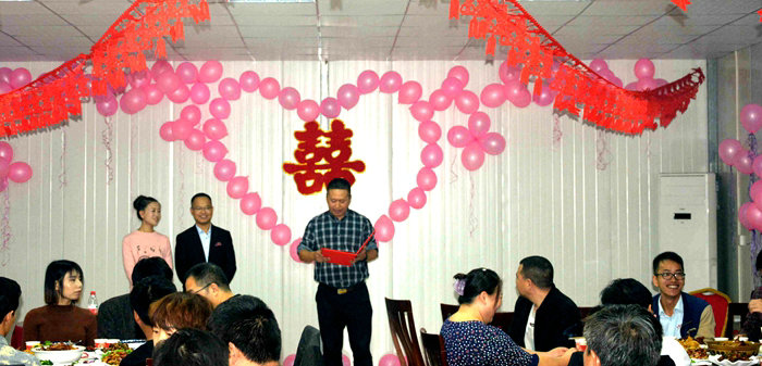 項目經理為新人證婚,希望兩位新人永結同心、白頭偕老、共建幸福美滿的家庭,用聰明才智、青春熱情為項目建設增光添彩。作為全體職工“娘家”的公司工會派出代表為新人主持婚禮,代表公司工會向兩位新人送上禮品和祝福,希望兩位新人在今后的日子里互敬互愛、相濡以沫、風雨同舟,并介紹了他們相識、相知、相戀的愛情故事。
