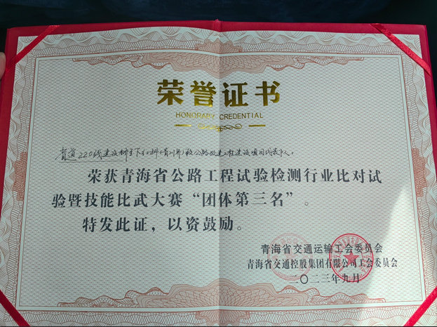 近日,北新路橋集團西安分公司省道220線建下公路改建工程4標項目試驗員吳海龍,代表項目部參加青海省公路工程試驗檢測行業(yè)比對試驗暨技能比武大賽,并榮獲“團體第三名”。
