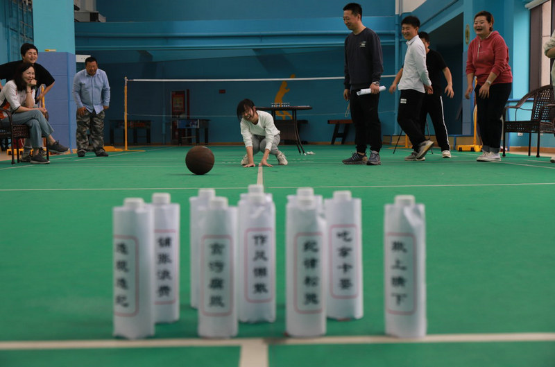 趣味運動會上,“重拳出擊打倒腐敗”比賽最受大家歡迎,隨著裁判一聲令下,參賽選手持“重拳”,瞄準“收受賄賂”“吃拿卡要”“違規(guī)違紀”“欺上瞞下”等不正之風,用力擊倒。賽場上參賽人員激烈競爭,精彩場面不斷出現(xiàn),加油聲、吶喊聲、歡笑聲不絕于耳,在場的觀眾們都躍躍欲試,都想要嘗試一下到底能擊中多少“不正之風”。