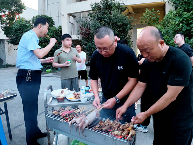 李秀鸞、劉翠景兩位廚師從上午忙到晚,為大家期盼的盛宴施展廚藝,經(jīng)過烹、炸、炒、燉、蒸等一番操作,擺上餐桌的紅燒鯉魚、清蒸螃蟹、清燉羊排、爆炒臘肉等美食色香味俱全,讓員工大飽口福。幾名年輕員工在院子里支起燒烤爐,加上木炭,然后將員工們愛吃的羊肉串、各種蔬菜串、年糕串和調(diào)料端來,點(diǎn)燃木炭,大家踴躍動(dòng)手燒烤,抹油、撒調(diào)料,這一面烤一兩分鐘,翻個(gè)身烤另一面,一板接一板地烤,烤好的羊肉串、蔬菜串,除分發(fā)給未在一旁的員工品嘗外,其余傳遞到餐桌上。油煙在院子里四處彌漫,煙火氣十足,方圓幾百米便能嗅到濃濃的燒烤香味。