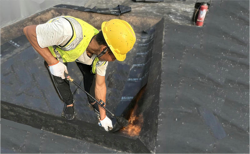 北新路橋集團長沙分公司舞陽片區(qū)項目工人手持防水作業(yè)專用噴火槍,將防水材料緊密地貼合在墊層表面,仿若質量安全密不可分,正如我們對品質的不懈追求。