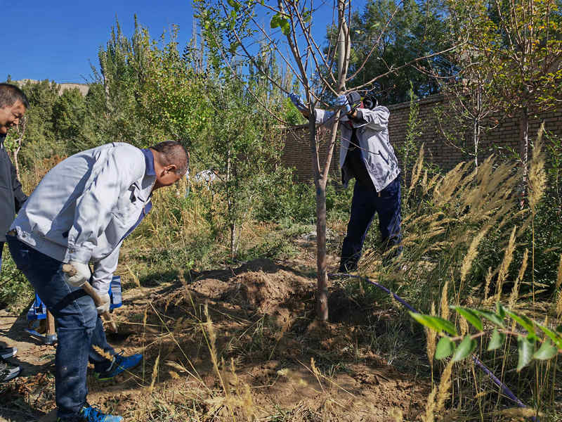 在植樹活動中,分公司全體黨員充分發(fā)揮優(yōu)良作風,迎著秋風揮鍬大干,挖坑、培土、澆水,現(xiàn)場熱火朝天、忙碌有序。為確保樹木的成活率,采用滴灌技術進行澆水,用木棍組成三角支架進行固定捆綁,讓其不容易倒下。經(jīng)過大家的共同努力,幾十棵新栽的蘋果樹、榆樹在秋風中搖曳,植樹綠化將有效改善工作生活環(huán)境。