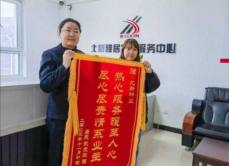 劉新梅立即聯(lián)系到該售房部,售房部武先生表示:“小狗是他女朋友喂養(yǎng)的,“它”是家中重要一員,女朋友正因小狗的丟失傷心難過!” 成功找回心愛的寵物,武先生及其女友欣喜若狂,對(duì)劉新梅表示了鄭重感謝,并于11月20日再次來到北新雅居物業(yè)服務(wù)中心送上錦旗。