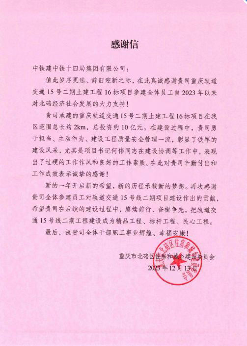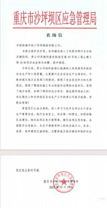 冬寒信暖,備受鼓舞。元旦前夕,中國(guó)鐵建重慶軌道交通15號(hào)線二期總承包部16標(biāo)14局項(xiàng)目部收到重慶市沙坪壩區(qū)軌道交通辦公室、重慶市沙坪壩區(qū)應(yīng)急管理局、重慶市北碚區(qū)住房和城鄉(xiāng)建設(shè)委員會(huì)等發(fā)來的感謝信,信中對(duì)項(xiàng)目部恪盡職守精準(zhǔn)履約,施工工序注重水保環(huán)保“綠色施工”常態(tài)化,無煙塵、無噪音工地和棄土外運(yùn)不擾民給予了高度贊揚(yáng),肯定了項(xiàng)目部在施工過程中展現(xiàn)出披荊斬棘的奮發(fā)姿態(tài),孜孜不倦的創(chuàng)新精神。