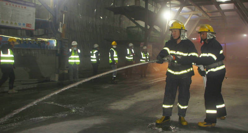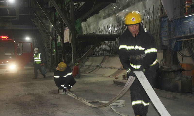 當天上午10時整,在京沈鐵路客專遼寧公司安全環(huán)保部的全程指導和白山市江源區(qū)松樹鎮(zhèn)消防隊的全力配合下,演練模擬沈白高鐵在建的東山隧道1#斜井大里程方向DK344+060處二襯防水板發(fā)生 “火災”險情。“隧道火災逃生疏散應急實戰(zhàn)演練開始”隨著項目部安全總監(jiān)谷慧強一聲令下。隧道內(nèi)頓時火光閃耀、煙霧彌漫,項目總工程師張強立即啟動安全應急預案,第一時間切斷電源,拉響警報。項目副經(jīng)理孫明軍率各應急演練小組分工負責,快速組織疏散作業(yè)人員有序到達安全地點。立即用滅火器及消防水源對可燃物進行緊急撲救。隨后在陣陣刺耳的警笛聲中,松樹鎮(zhèn)消防隊救援車趕至“火災”現(xiàn)場,頃刻間高壓水槍向火源發(fā)起猛烈沖擊,火勢漸漸熄滅.....。