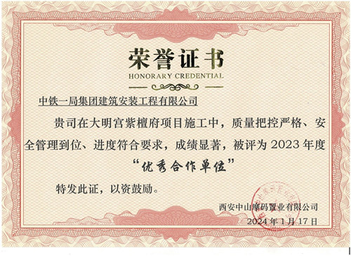 1月28日,中鐵一局建安公司金源檀府項目部收到業(yè)主單位西安中山摩碼置業(yè)有限公司發(fā)來表揚信和榮譽證書,信中對項目部項目管理、工程進度及安全質量給予充分肯定。