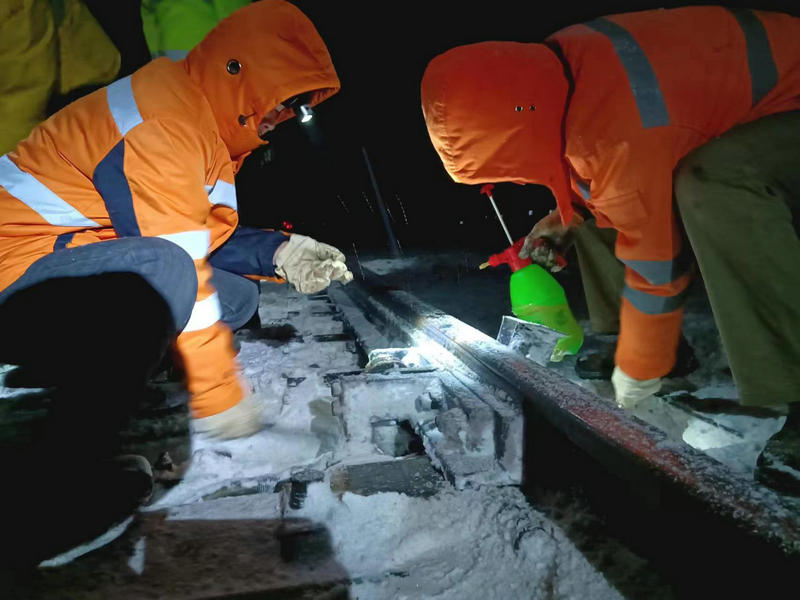 在白雪茫茫的鐵路線路上,合肥電務(wù)段亳州車間全體干部職工不畏嚴(yán)寒,積極奮戰(zhàn),手持扁鏟、掃把、鐵锨等工具,認(rèn)真清掃道岔尖軌和基本軌之間厚厚的積雪,使用扁鏟清除道岔勾頭與鎖閉桿縫隙的冰塊,及時(shí)噴灑防凍液,防止道岔結(jié)冰導(dǎo)致道岔轉(zhuǎn)換故障。在掃雪過程中,大家認(rèn)真檢查道岔表示桿、勾頭下部、尖軌頂鐵等關(guān)鍵部位的積雪和冰塊,認(rèn)真清掃,及時(shí)清除。凜冽的寒風(fēng)吹到臉上,手被凍僵,臉被大風(fēng)吹得生疼,列車通過時(shí)揚(yáng)起的大片雪粒灌進(jìn)脖子里,讓人瞬間透心涼。迎著凜冽的寒風(fēng),大家沒有絲毫的怨言,始終以飽滿的工作熱情堅(jiān)守在掃雪除冰一線,大家心中已有一個(gè)目標(biāo),就是確保春運(yùn)列車安全暢通運(yùn)行。