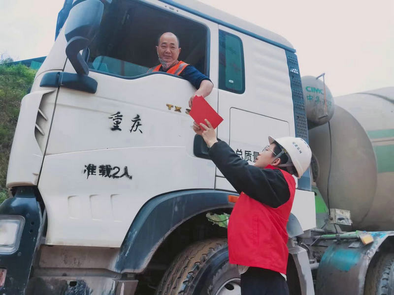 項(xiàng)目部學(xué)雷鋒志愿者為進(jìn)入隧道罐車司機(jī)發(fā)放安全、質(zhì)量、環(huán)保宣傳傳單