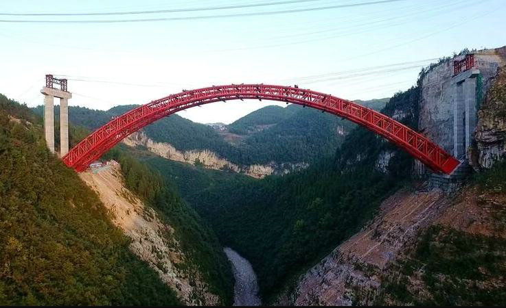 大橋橫跨深山峽谷,地勢(shì)險(xiǎn)峻,相對(duì)高差約183米,拱座邊坡卸載的垂直高度達(dá)80米。在懸崖峭壁上,采用光面爆破開挖基礎(chǔ),攻克了拱座4300多方大體積混凝土澆筑、40多米高薄壁交界墩澆筑、大噸位拱肋吊裝等施工難點(diǎn),為深山峽谷建造橋梁積累了施工經(jīng)驗(yàn),為建恩高速通車提速。