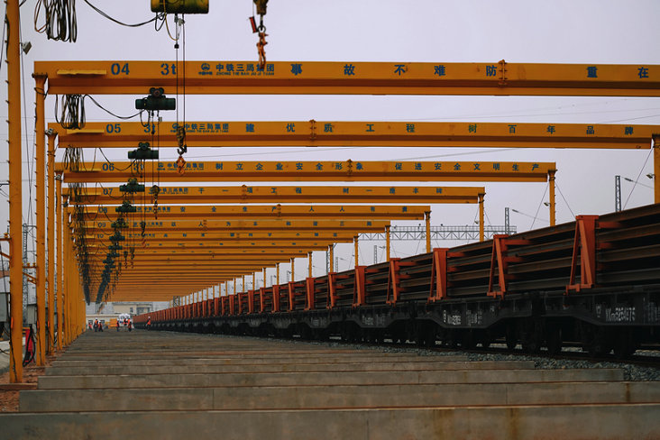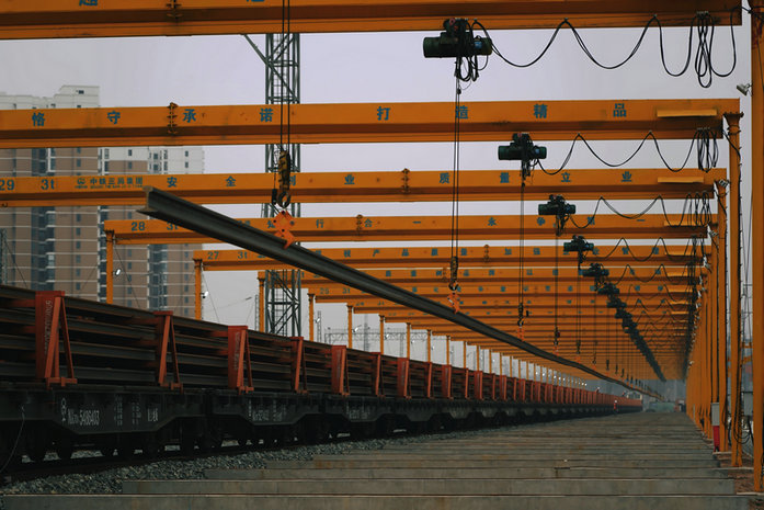 宜昌東鋪軌基地內(nèi)設(shè)置長軌存放區(qū)1處,配置有32臺固定式群吊,最大存軌能力112.5公里。長軌進場標志著宜興鐵路鋼軌的生產(chǎn)、焊接、運輸渠道已順利打通。
