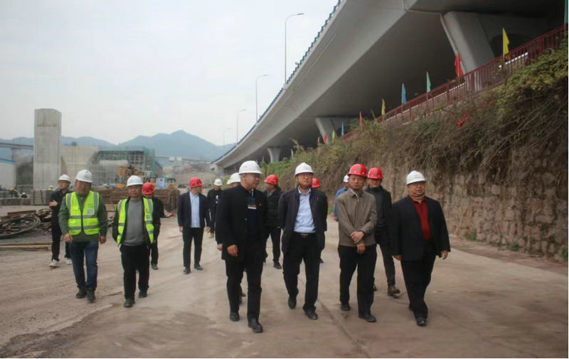 總承包部指揮長(zhǎng)李兵(右1)、黨工委書(shū)記王向平(右3)、副指揮長(zhǎng)陳華富(左2)在現(xiàn)場(chǎng)巡查