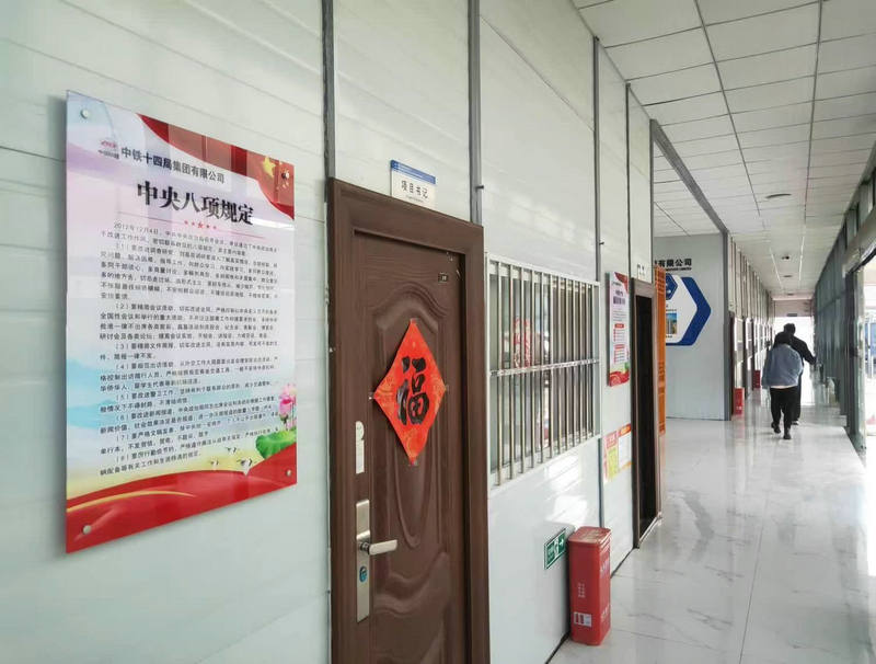 項目部黨政主管門口張貼著“中央八項規(guī)定”、“中國共產(chǎn)黨廉潔自律準則”等有關(guān)警示標牌,起到居安思危、警鐘長鳴的警示作用