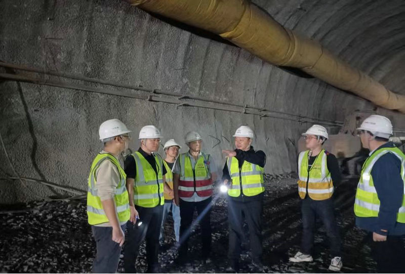 公司副總經(jīng)理兼總工程師李洪江(右3)工會(huì)副主席張泉濱(右1)在中梁山隧道進(jìn)口進(jìn)行技術(shù)指導(dǎo)