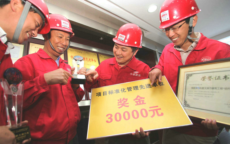 2、中鐵十八局集團(tuán)建安公司副總經(jīng)理張曉鵬(右二)、北疆電廠項目經(jīng)理鞠正平(左二)、遵化項目經(jīng)理李緯(右一)等人手捧天津“結(jié)構(gòu)海河杯”等獎牌獎杯(曾海波 伍振 攝)