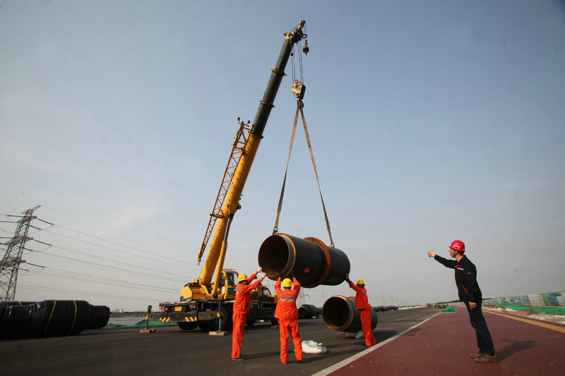 4、中鐵十八局集團(tuán)建安公司技術(shù)人員在天津市濱海新區(qū)北疆電廠至中新天津生態(tài)城的熱力主干線現(xiàn)場吊裝熱力管(曾海波 伍振 攝)