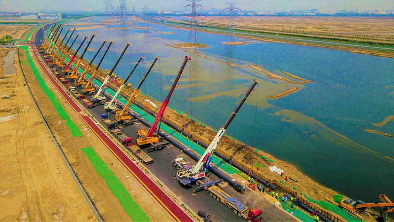 擔(dān)負(fù)該項目施工的中鐵十八局集團(tuán)建安公司北疆電廠項目經(jīng)理鞠正平介紹,該項目面臨地下水位偏高、管道下穿高速公路高架橋及人工河道,施工段孤石遍布等困難。項目團(tuán)隊反復(fù)研討、細(xì)致測算、模擬實驗,通過優(yōu)化方案,創(chuàng)新運(yùn)用沉箱工作井、整體焊接吊裝、大直徑頂管等施工工藝,突破了施工瓶頸。特別是通過16臺100噸到500噸不等噸位的起重機(jī)整齊劃一地排成一排,在技術(shù)人員的有序調(diào)度、駕駛員的靈活操作下,吊車準(zhǔn)確無誤地將焊接完畢的總長近1600米、重達(dá)800噸的四段管線吊裝至既定基坑,確保了管線主干線在既定工期內(nèi)實現(xiàn)貫通。