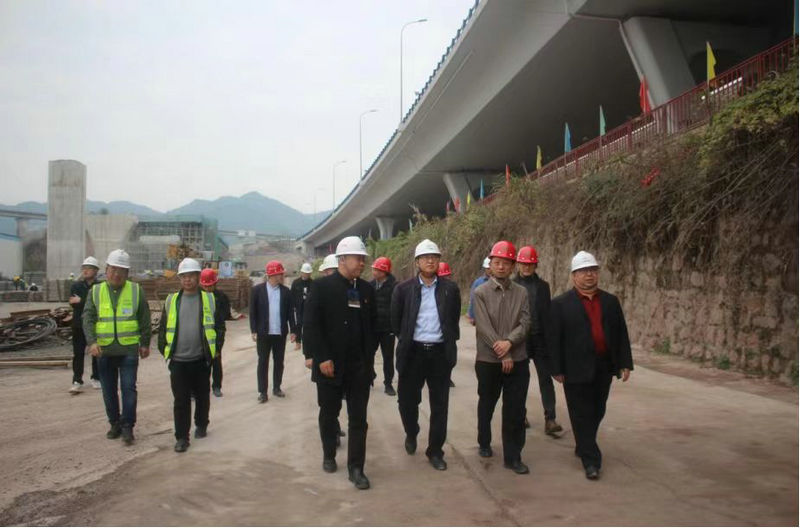 總承包部指揮長李兵(右1)、黨工委書記王向平(右3)、副指揮長陳華富(左2)在現(xiàn)場巡查