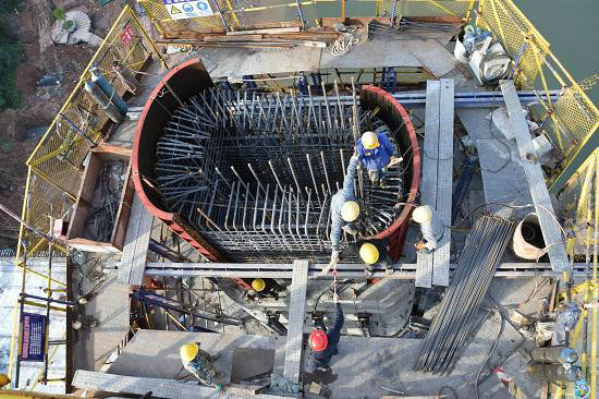潭頭大橋是福建上杭地區(qū)第一座斜拉橋,是城市建設(shè)重點工程。大橋全長323米,為獨塔單索面鋼混結(jié)合梁斜拉結(jié)構(gòu),主梁寬32米,為雙向四車道。大橋主塔采用鋼筋混凝土結(jié)構(gòu),上部設(shè)計成春筍造型,寓意“年年好,節(jié)節(jié)高”,下部水滴造型寓意“水納百川,匯聚八方”。主塔基礎(chǔ)為長20.5米寬20.5米高5米整體式承臺,承臺下部采用16根長60米、直徑2米鉆孔樁基礎(chǔ)集群聯(lián)結(jié),塔身高87.5米,分為23個節(jié)段施工。主塔塔身高、造型復(fù)雜,線性控制難度大、施工精度要求高。為了讓主塔安全快速“長高”,項目采用液壓爬模施工技術(shù)。施工過程中,綜合應(yīng)用多種測量手段,采用高程、平面位置測控、索塔結(jié)構(gòu)應(yīng)力和變形監(jiān)控技術(shù),在多種工況以及天氣因素影響下,對索塔各部位的應(yīng)力狀態(tài)和變形情況進行監(jiān)控,確保滿足索塔施工精度要求。在每次爬升前進行詳細(xì)認(rèn)真的技術(shù)交底,實時監(jiān)測施工安全,確保施工穩(wěn)步順利,進入塔身施工后,以平均每月3節(jié)的速度向上升高。