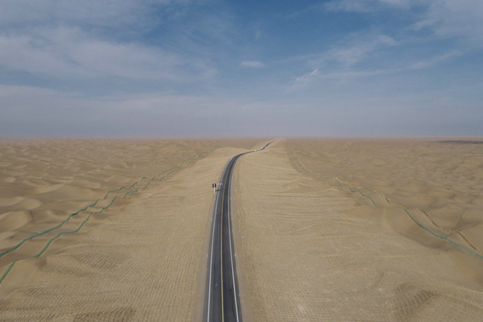 圖昆四標沙漠公路.何衛(wèi)平攝據(jù)了解,圖昆沙漠公路全長126.202公里。本合同段采用二級公路標準建設,路線全長55.845km,設計時速為 80km/h,本工程造價2.96億元,這個項目技術標準高,施工難度大,大大小小的沙包有500多個,其中最高的沙包18.3米,最低的沙坑16.4米。